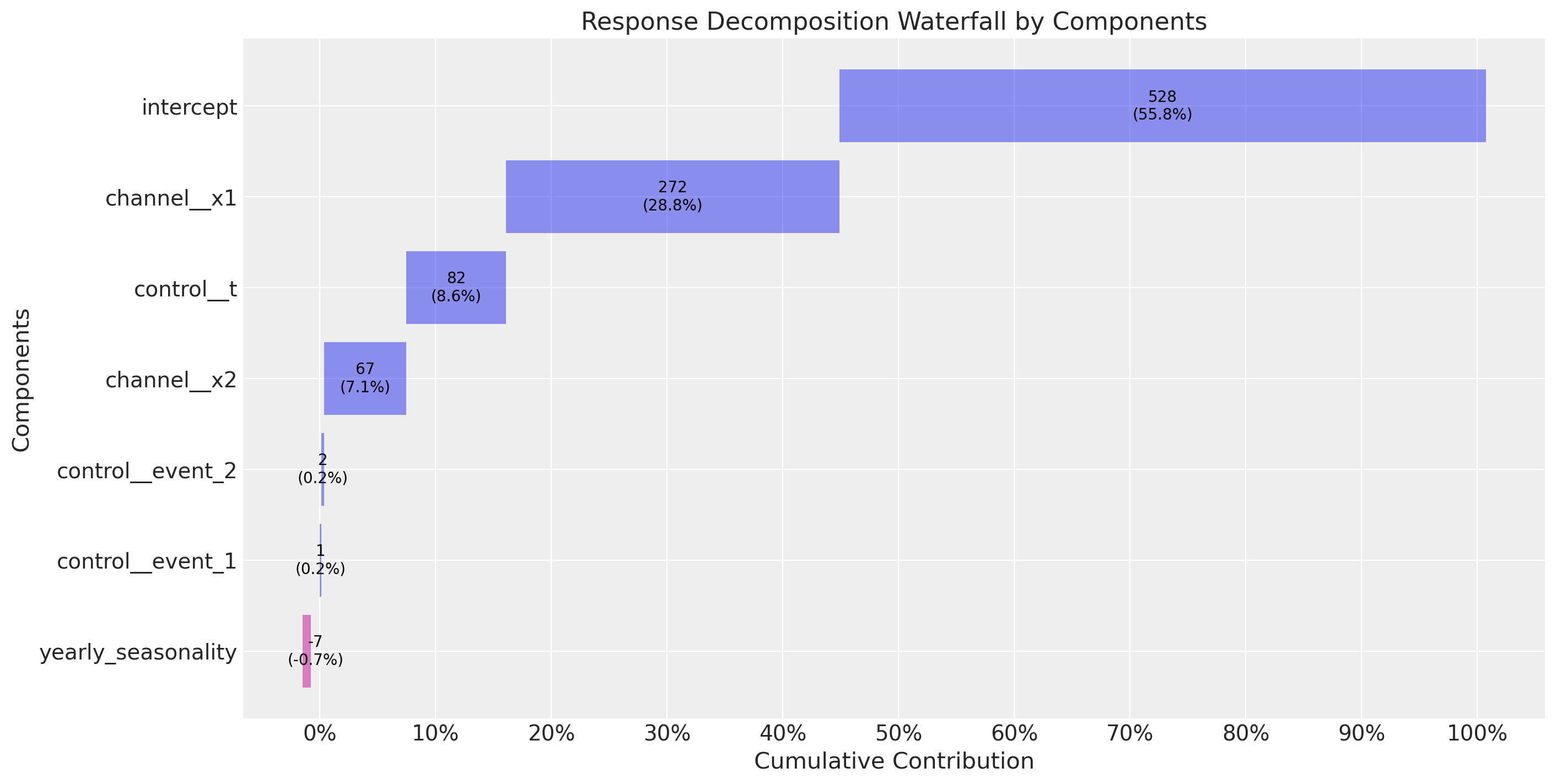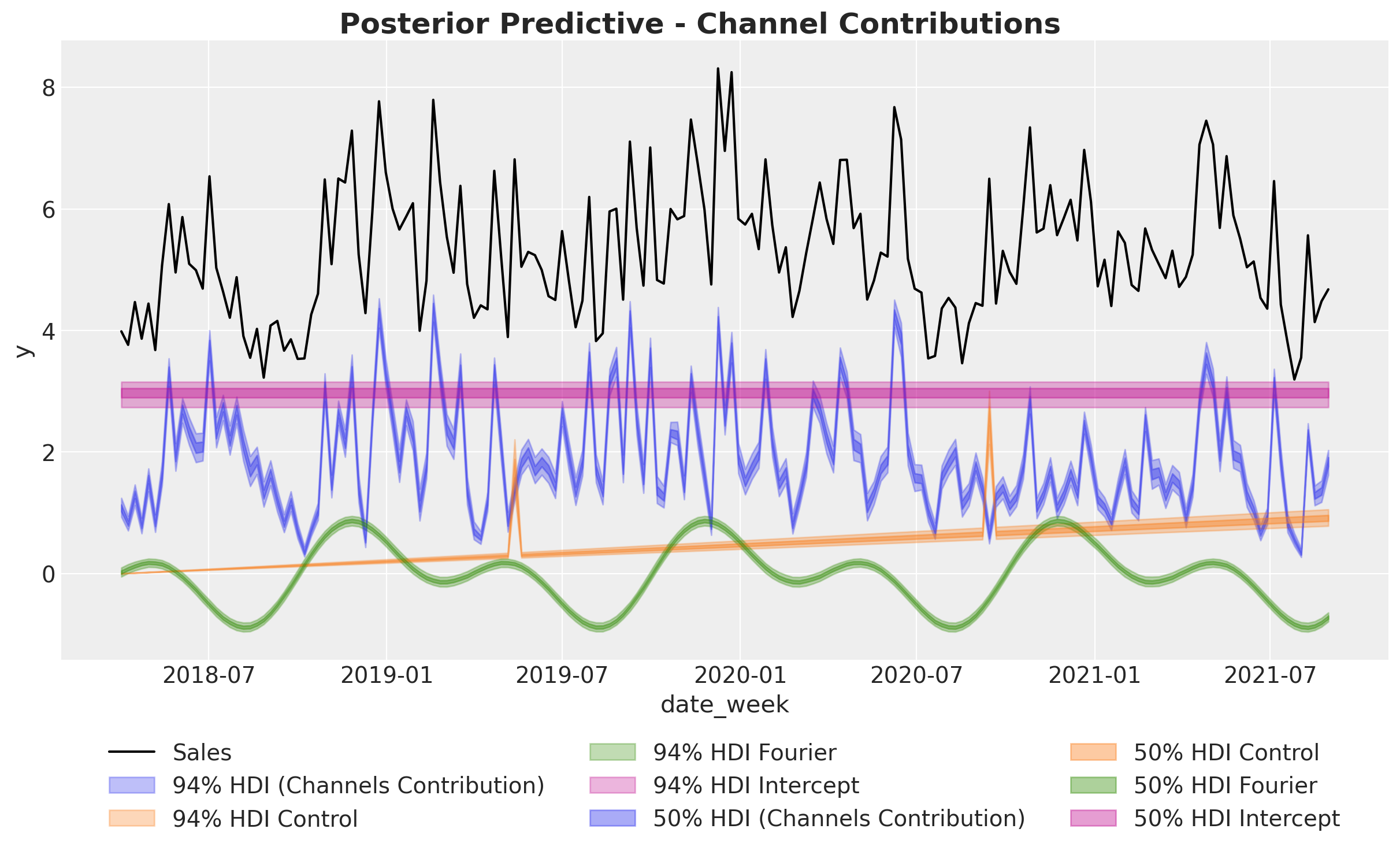 Time-varying Intercept: Capture time-varying baseline contributions in your model (using modern and efficient Gaussian processes approximation methods). That is, we allow the intercept term \(\alpha = \alpha(t)\) to vary over time. See mmm_tvp_example.