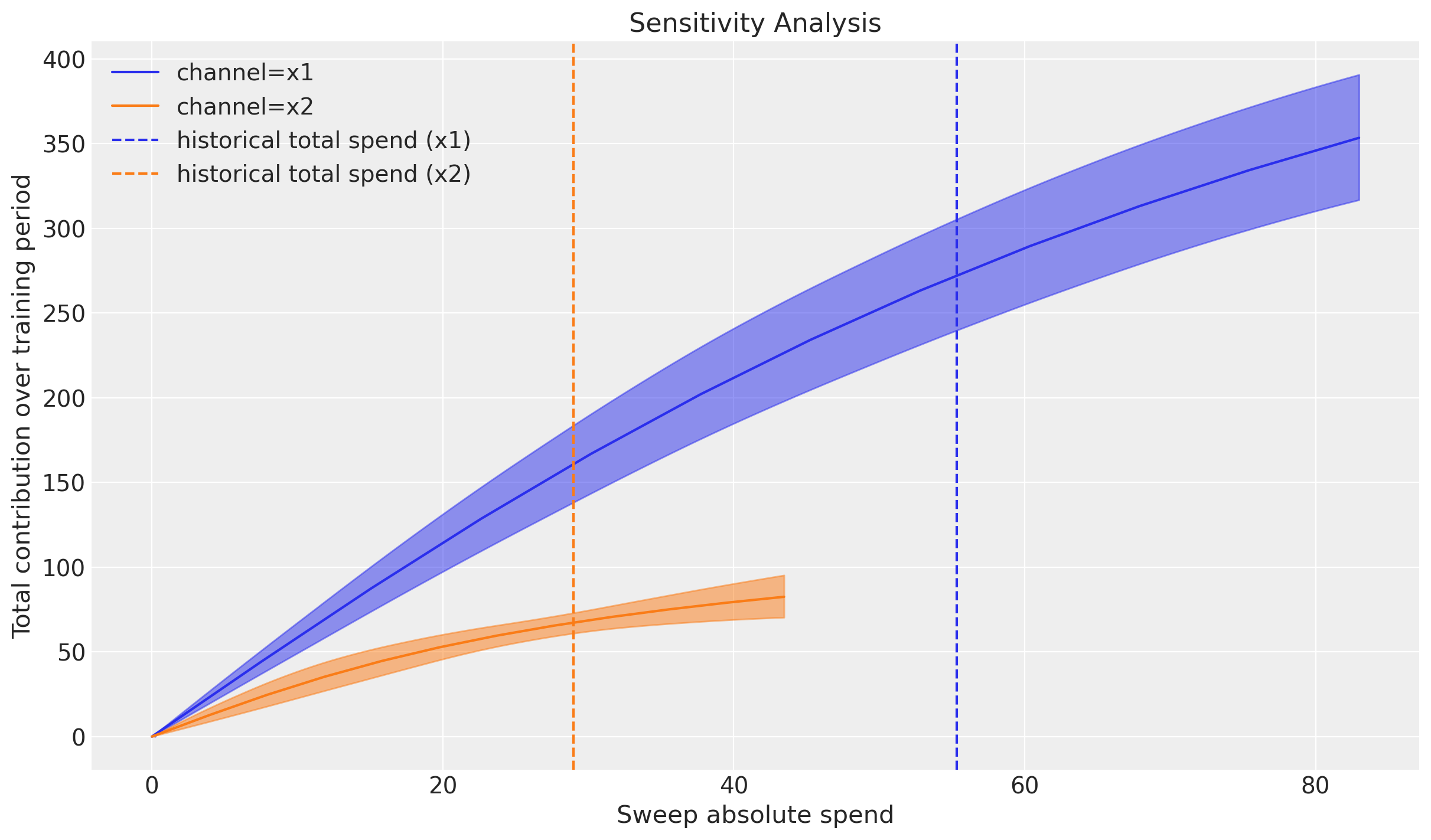 In addition, there is a saturation effect. Meaning, the effect of spend on sales is not linear but saturates at some point.