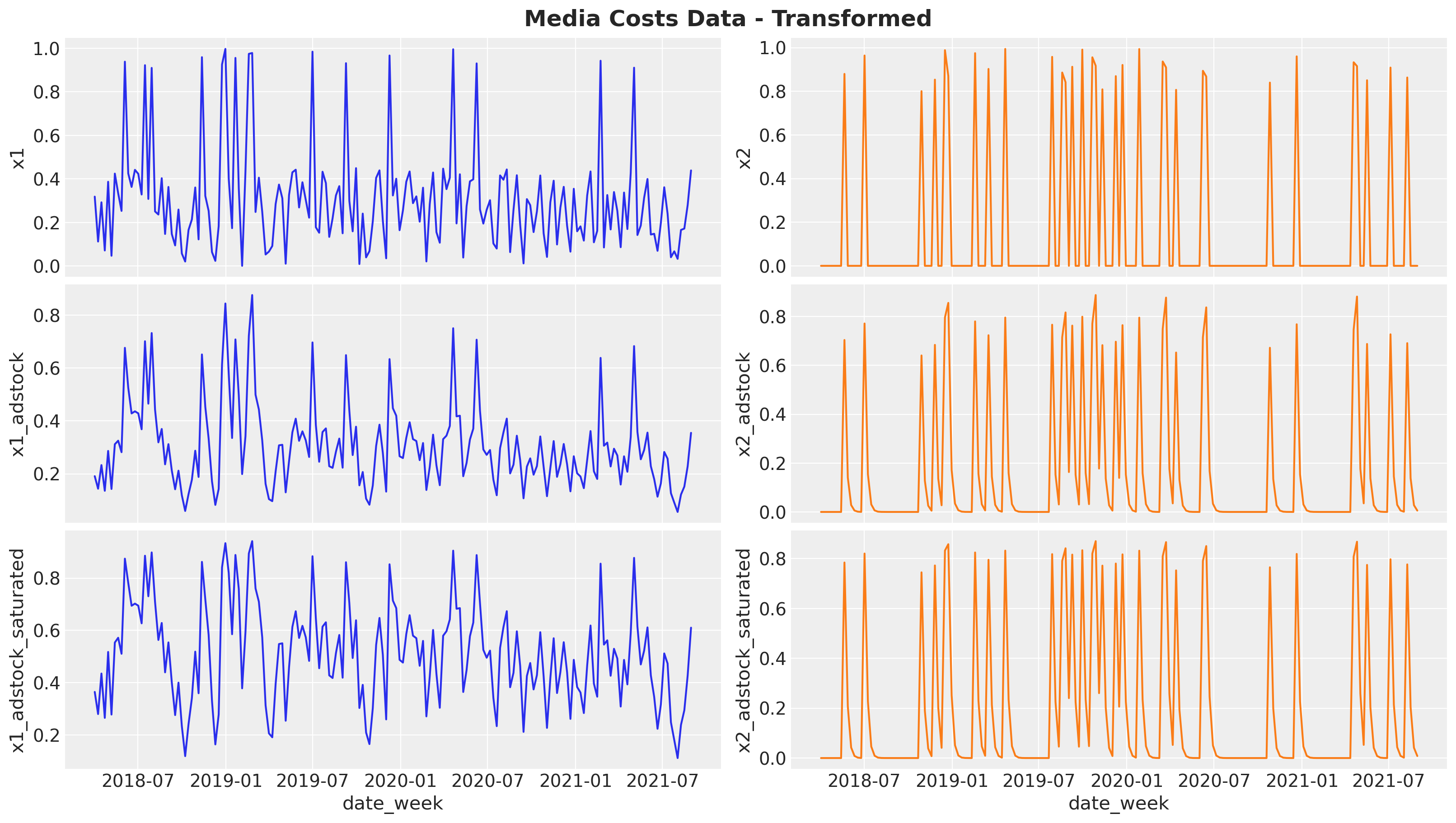 Next, we pass the raw signal through the two transformations: first the geometric adstock (carryover effect) and then the logistic saturation. Note that we set the parameters ourselves, but we will recover them back from the model.