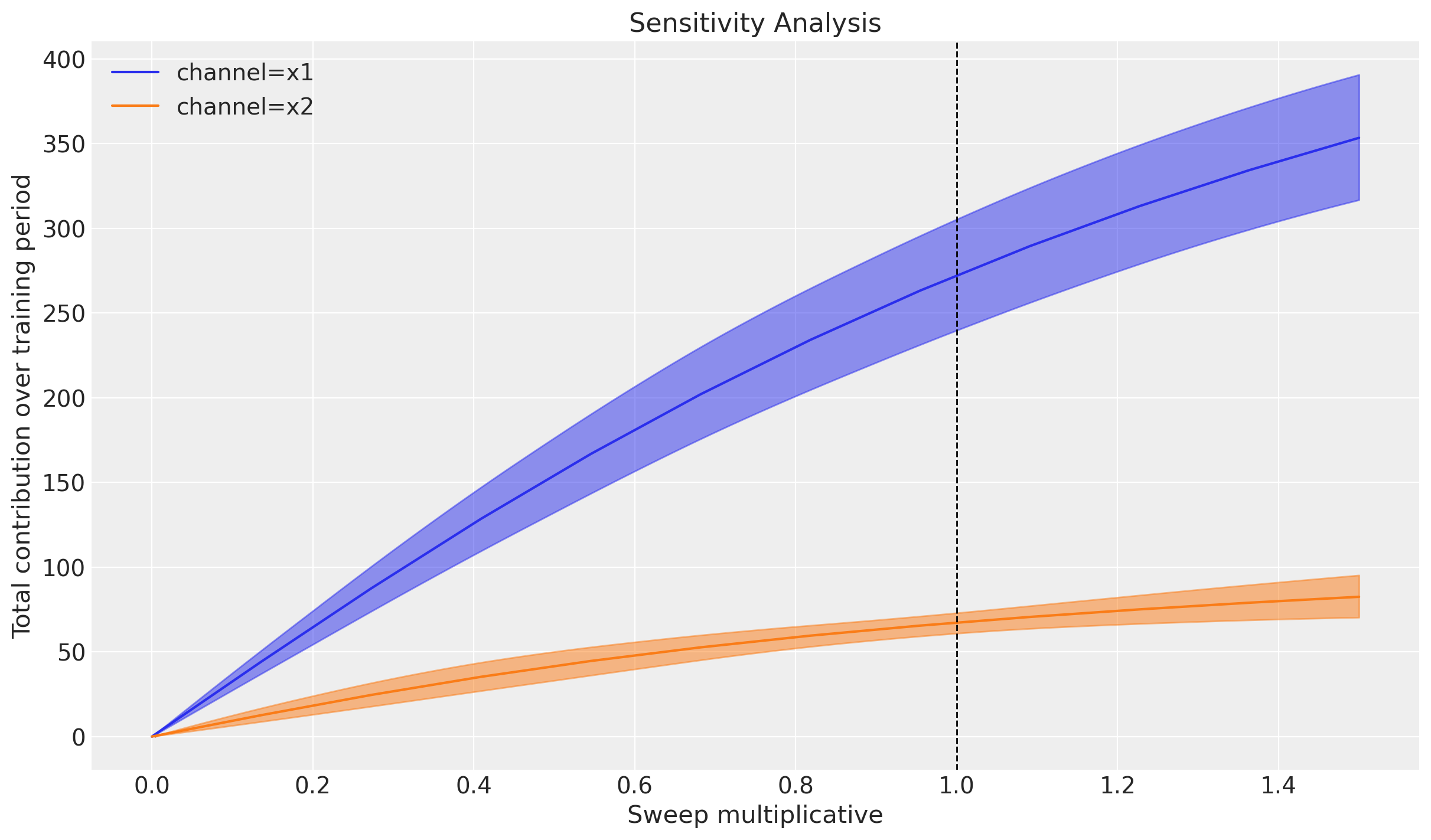 Now, given the DAG outlined above, we understand that there is a causal relationship between marketing and sales, but what is the nature of that relationship? In this case, we will assume that this relationship is not linear, for example, a \(10\%\) increase in channel \(x_{1}\) spend does not necessarily translate into a \(10\%\) increase in sales. This can be explained by two phenomena: