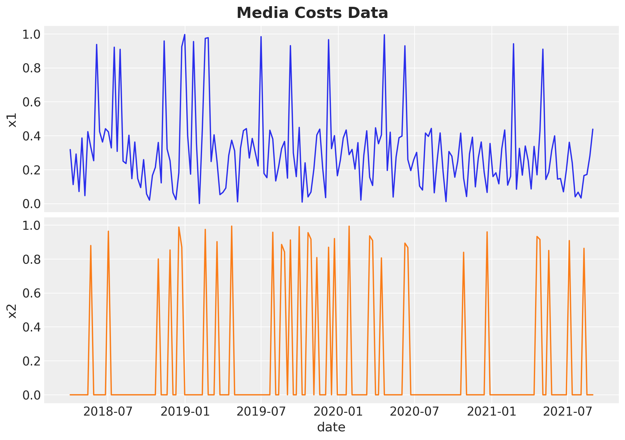 Remark: By design, \(x_{1}\) should resemble a typical paid social channel and \(x_{2}\) an offline (e.g. TV) spend time series.